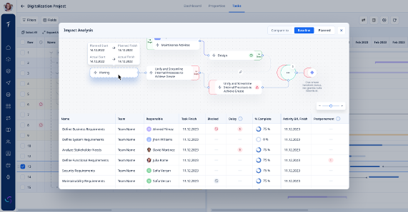 Primavera P6 ve MS Project ile çift yönlü doğal entegrasyonu ve entegre Gantt ekranı sayesinde görevlerin proje takvimine etkisini anlık izleyin; Change‑Set ile kontrollü güncellemeler yapın, tatil ve kapasite limitlerini otomatik hesaba katan proaktif uyarı sistemiyle sapmaları engelleyin.