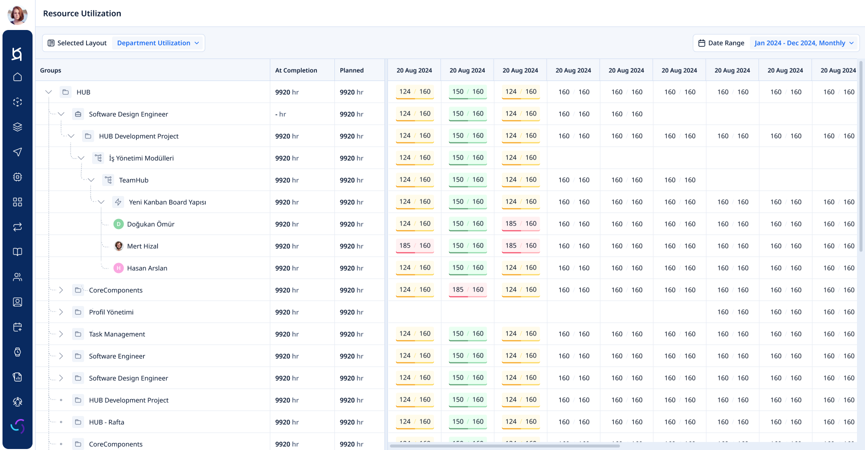 360° kaynak kullanım panelleri planlanan ve gerçekleşen eforu hiyerarşik olarak canlı sunar; atama anında kapasite etkisini gösterir ve timesheet verilerinden beslenen "kalan efor" tahminleriyle darboğazları önceden görmenizi sağlar.