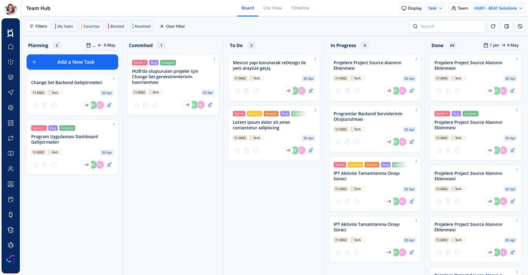 TeamHub’ın merkezi backlog’unda farklı program ve projelerden gelen işleri tek havuzda toplayın; yerleşik Kanban ile entegre Gantt panelleri sayesinde plan‑icra uyumunu anlık izleyin. Kuruma özel, konfigüre edilebilir iş akışları süreç disiplinini pekiştirir ve mühendislik ekiplerinizin tüm proje ile kaynak kısıtlarını tek ekranda yönetmesini sağlar.